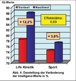 Besonders bemerkenswerte Ergebnisse ermittelte der Zahlen-Verbindungs-Test von Oswald und Roth: mit einer Effektstärke von 0,69 konnte gezeigt werden, dass Life Kinetik im Vergleich zur Sportgruppe die Intelligenzwerte mit 12,2% um mehr als das Dreifache erhöhen konnte. Die gemessenen Intelligenzwerte lagen bei der Life Kinetik Gruppe nach nur 5 Wochen mit 87 im Normalbereich, obwohl sie vorher mit 78 noch weit unterdurchschnittlich waren. Verblüfft war das Forschungsteam von den sehr hohen Effektstärken. Prof. Dr. Matthias Grünke: "Solch hohe Werte sind im Zusammenhang mit einem Training der Aufmerksamkeit oder der fluiden Intelligenz ungewöhnlich und können normalerweise so nicht beobachtet werden."