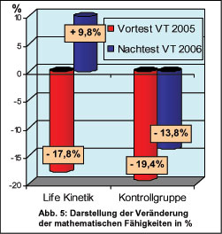 Universität Augsburg mit 20 von 42 Schülern im Alter von 9 bis 10 Jahren ein dreiwöchiges Life Kinetik Training mit 11 Trainingseinheiten zwischen 15 und 45 Minuten Dauer (Haas, 2011). Getestet wurde anhand zweier Bayernweiter Mathematik-Vergleichsarbeiten der Jahre 2005 und 2006 die Auswirkungen des Life Kinetik Trainings auf die kognitive Leistungsfähigkeit der Schüler. Dabei konnte festgestellt werden, dass sich die Life Kinetik Gruppe um 44,74% verbesserte und damit um fast das Dreifache gegenüber der Kontrollgruppe (15,28%). Besonders in den Bereichen "Anwenden mathematischer Fertigkeiten und Fähigkeiten in komplexeren Kontexten" und "Verknüpfung von Operationen und Prozessen" erzielte die Life Kinetik Gruppe ein weit überdurchschnittliches Ergebnis, das auch höchst signifikant ausfiel.
