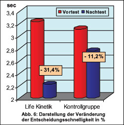 verbessern konnten. (Gras, 2011) Dabei trainierten von 14 Handballspielern der 3. Liga, die positionsspezifisch als Pärchen ausgewählt worden waren, 7 in 6 Wochen zwölf Mal je eine Stunde Life Kinetik. Mit Hilfe eines Videotestverfahrens und dem Interactive Voting System stellte er fest, dass sich die Life Kinetik Gruppe signifikant in der Entscheidungsqualität (um 4,76% und damit um genau doppelt so viel wie die Kontrollgruppe) und vor allem in der Entscheidungsgeschwindigkeit (um 31,39% und damit um fast das Dreifache der Kontrollgruppe) massiv verbesserte.